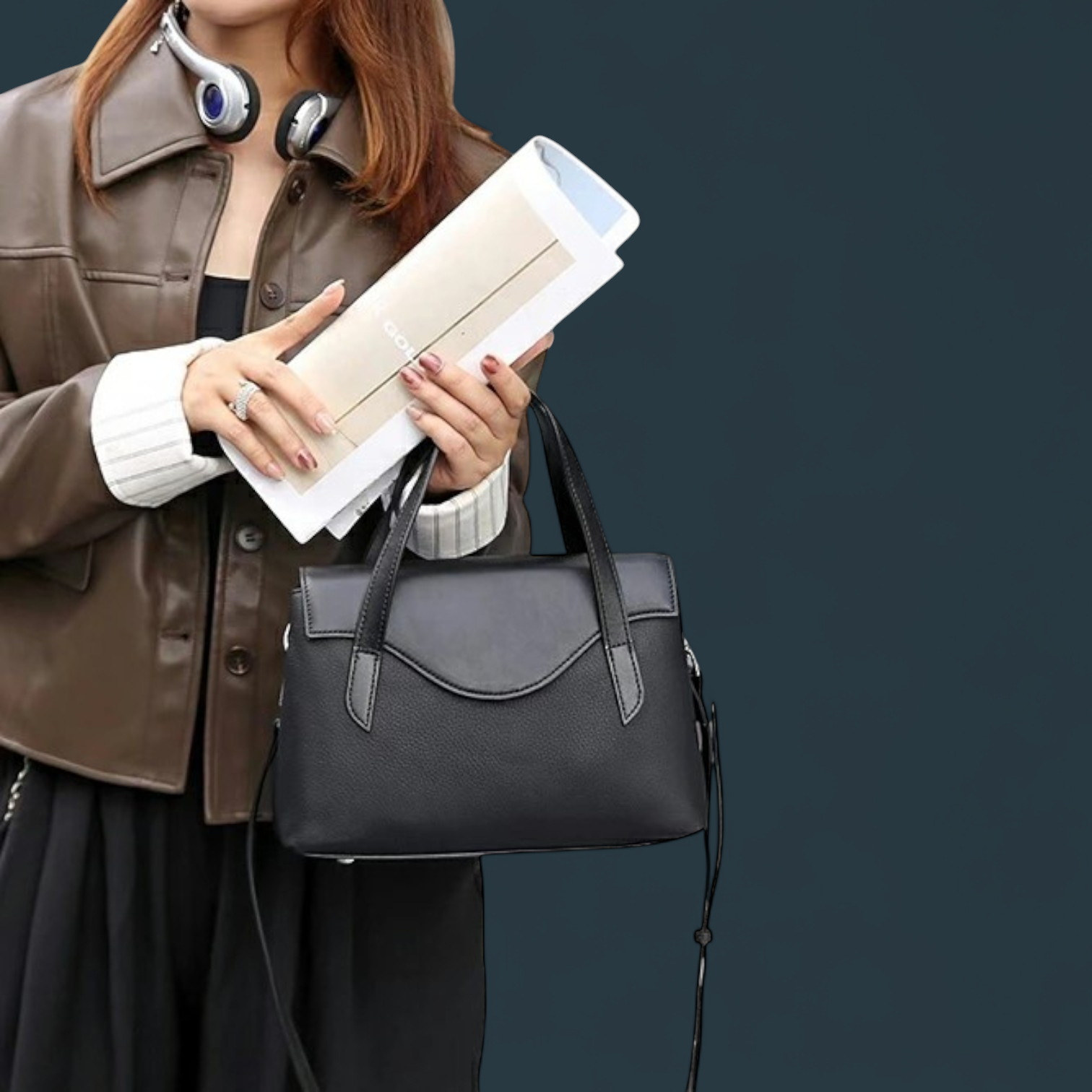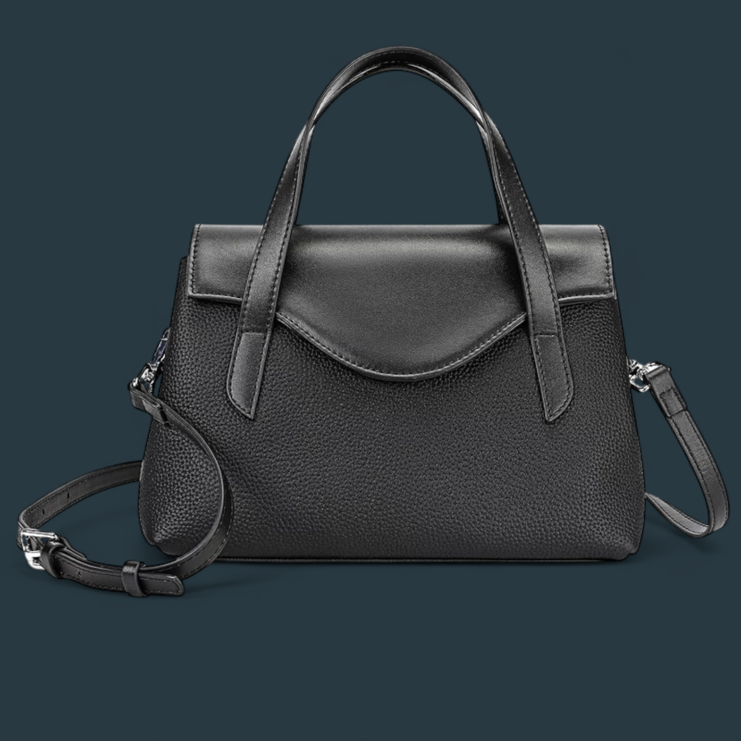 Geanta are doua manere fixe pentru purtare in mana si doua curele reglabile si detasabile – una subtire si una mai lata – pentru a-ti adapta stilul si confortul in functie de tinuta.
